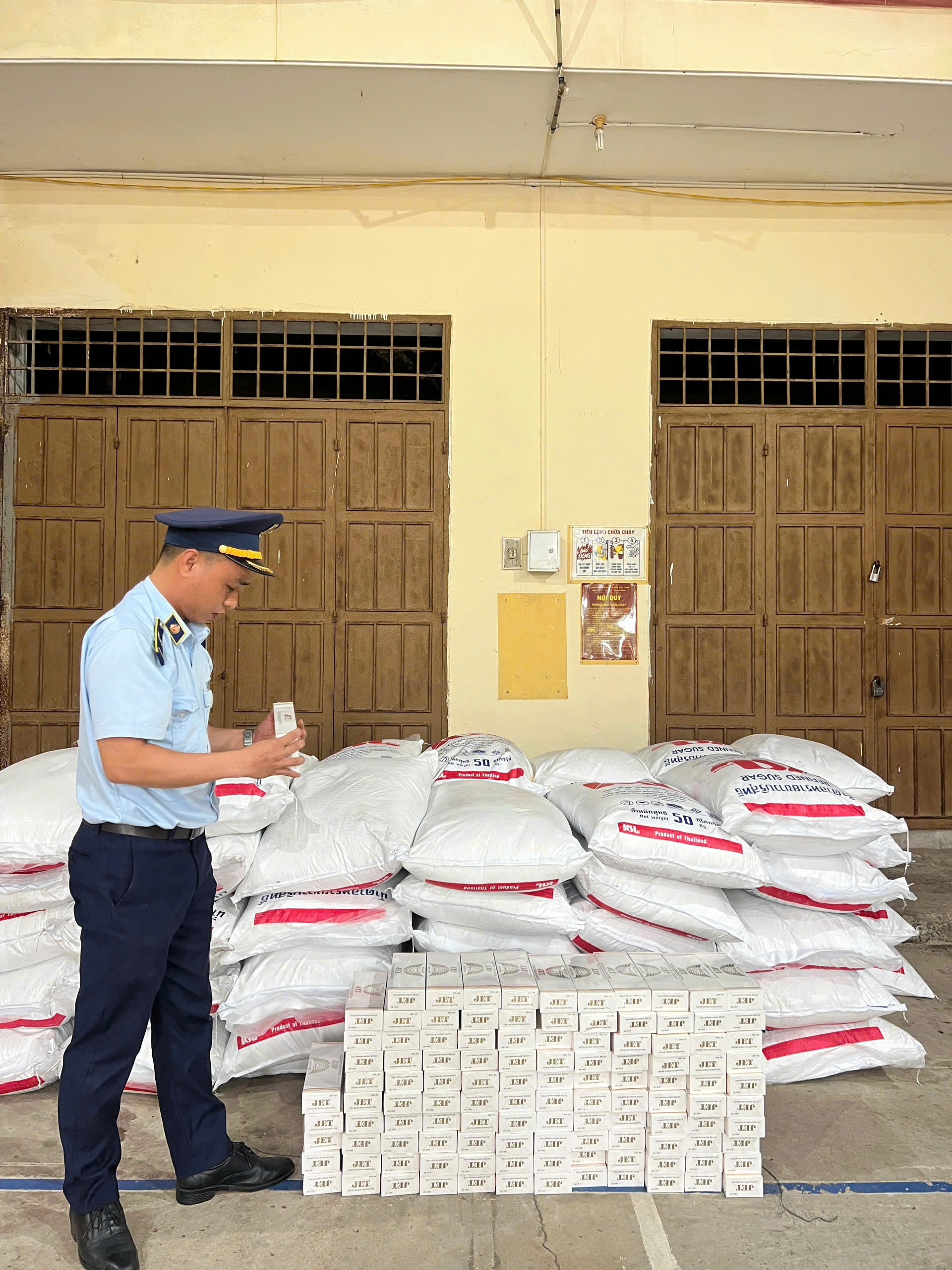 Qua khám phương tiện, phát hiện trên phương tiện vận tải nêu trên có cất giấu 65 bao Đường cát trắng hiệu KSL GROUP, loại 50kg/bao, ngày sản xuất: 10/2025, hạn sử dụng: 10/2027 do Thái Lan sản xuất với tổng khối lượng 3,25 tấn và 1.150 bao Thuốc lá điếu hiệu JET loại 20 điếu/bao xuất xứ Anh.